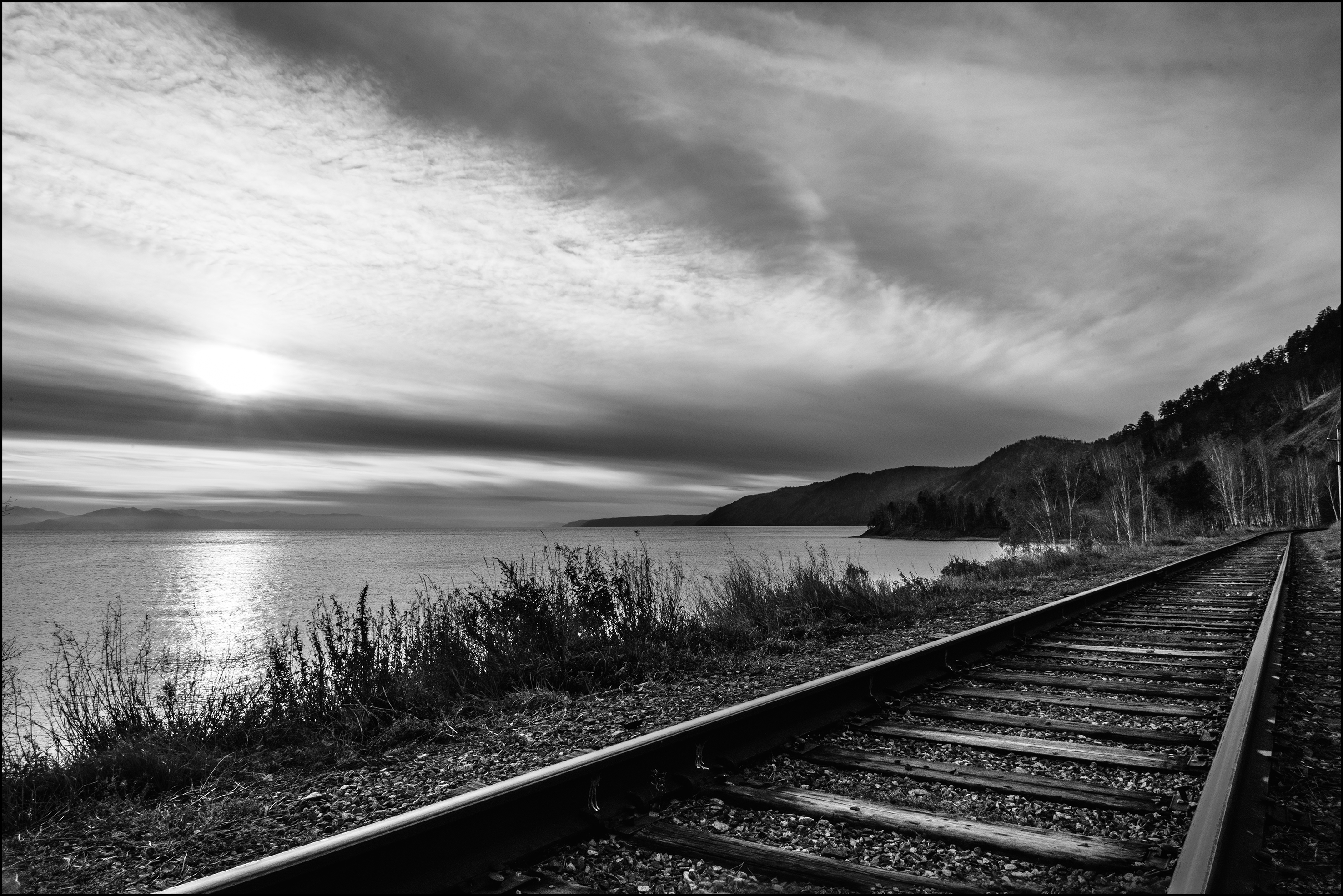De rit naar het Baikal-meer gaat via brede wegen, door de bossen (nog meer berken) en langs de boorden van de Angara. De Angara is de enige rivier die uit het Baikal-meer weg vloeit, een hele brede traagstromende rivier. Beetje zoals de Schelde maar dan nog véééél breder. Vanaf 1905 tot 1956 volgde ook de trein de oevers van de Angara om daarna langs de boorden van het meer verder te gaan. Deze route was echter zeer onderhevig aan overstromingen en aardverschuivingen en vanaf 1956 werd een nieuwe route door de bergen in gebruik genomen. Voor 1905 werd de spoorlijn hier volledig onderbroken. Tijdens de korte zomer werden passagiers en trein op een ferry geladen en overgezet, tijdens de winter werden er tijdelijke sporen gelegd dwars over het meer. Het ijs wordt hier in de winter maar liefst drie meter diep.